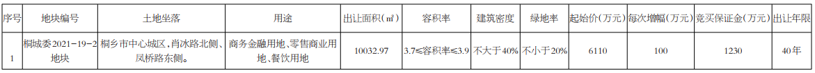 經(jīng)桐鄉(xiāng)市人民政府批準(zhǔn),桐鄉(xiāng)市自然資源和規(guī)劃局對(duì)下列地塊的土地使用權(quán)采用拍賣方式出讓?,F(xiàn)將有關(guān)事項(xiàng)公告如下: