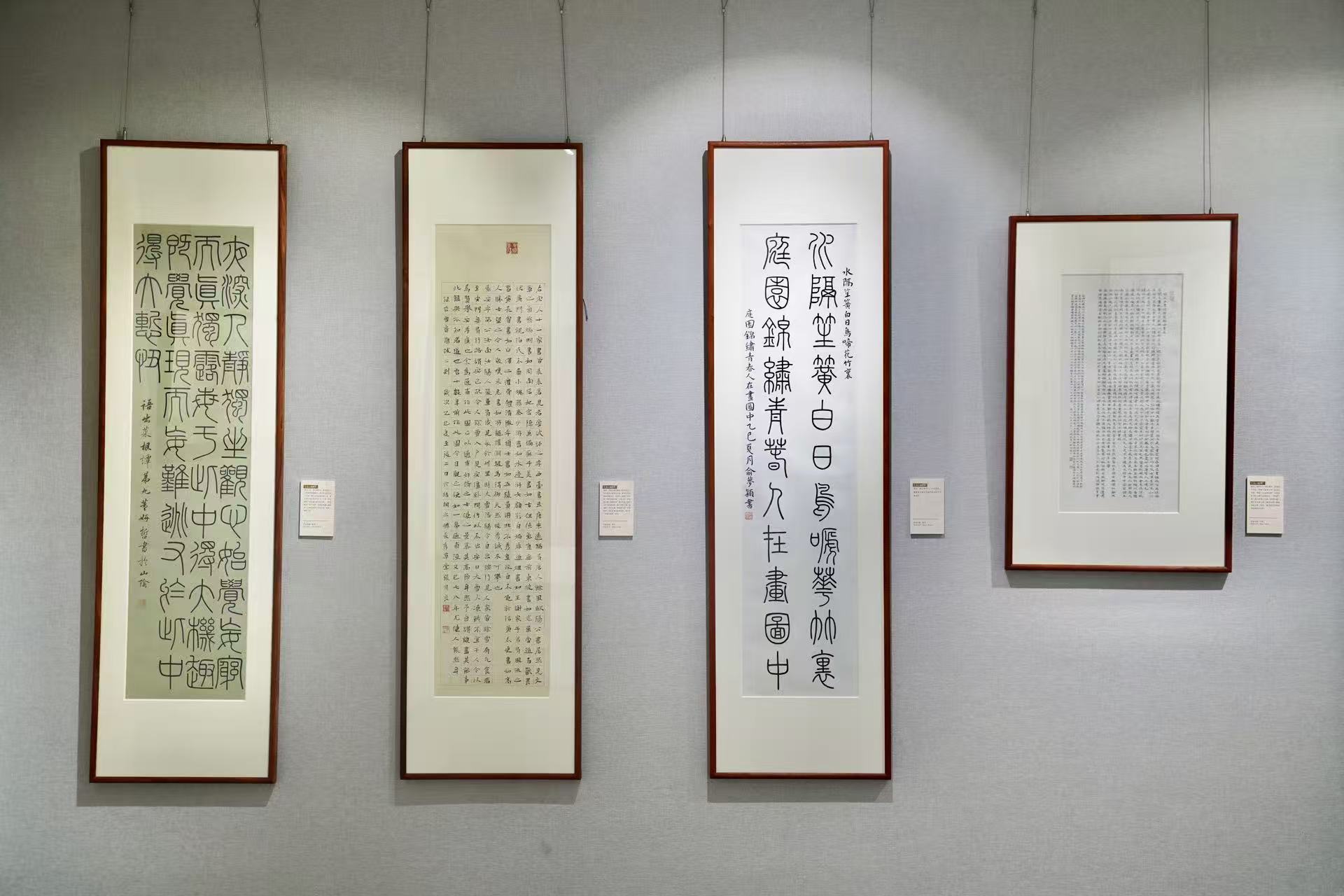 本次展覽以“書道向善”為主題,為期一個月,展出的76幅作品,包括楹聯(lián)、中堂、扇面等,涵蓋了真草隸篆各種書體,真書端雅、草書暢逸、篆書古樸、隸書沉雄,筆鋒所至,盡顯傳統(tǒng)筆墨之神韻與個人藝術之哲思。同時,作品展現(xiàn)了作者對黨、對祖國、對人民的赤誠熱愛,謳歌祖國建設的輝煌成就,贊美新時代的蓬勃氣象,讓書法藝術的感染力與思想性同頻共振。