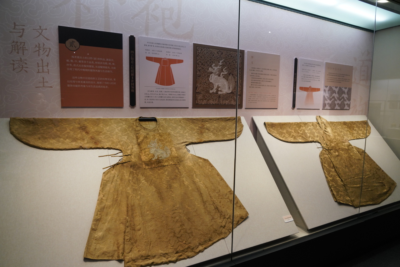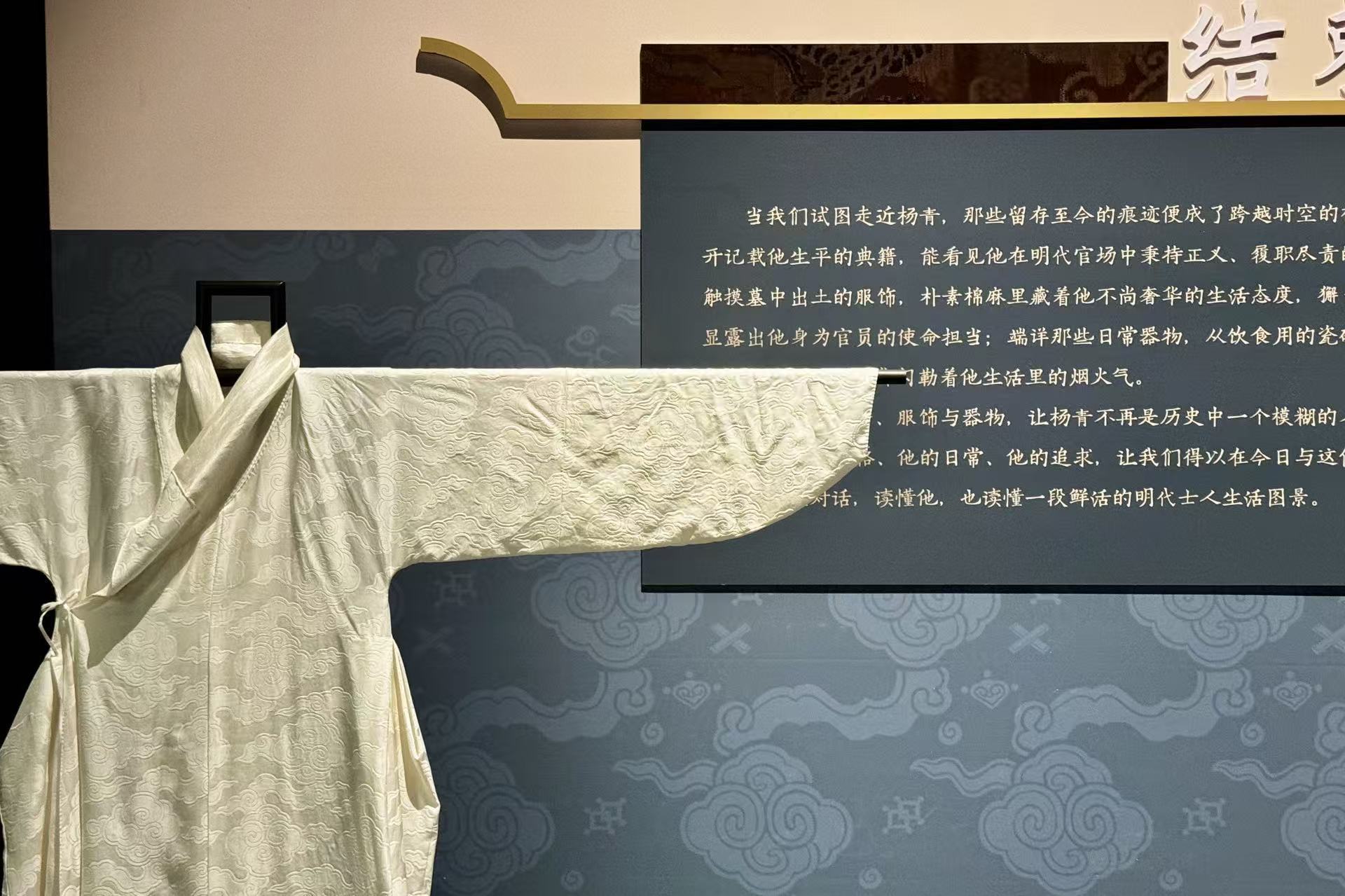 一件四合如意云紋緞獬豸補圓領袍、一頂做工精細且帶有網巾的烏紗帽、一雙與袍服搭配相得益彰的緞鞋……這是一套屬于明代風憲官楊青的穿戴。